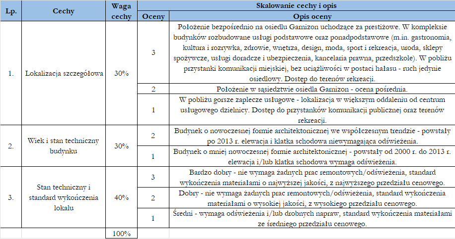 Każda z cech rynkowych w operacie szacunkowym jest opisana, dla których także określa się skalę ocen.